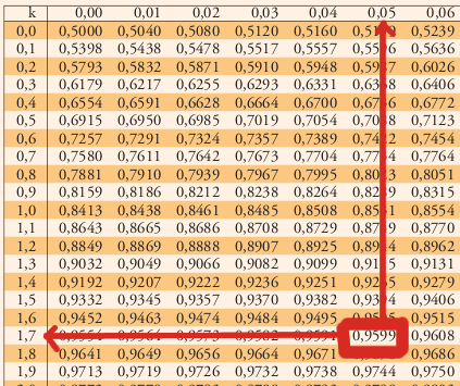 Miramos la tabla de la N(0,1) y vemos que el mas próximo a 0.96 es 0.9599.