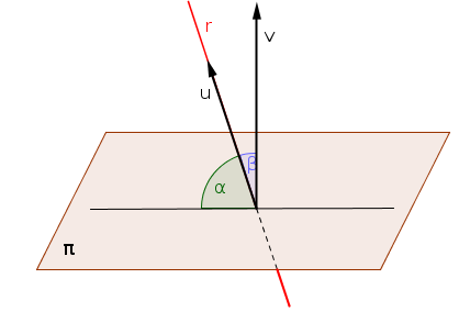 El ángulo entre una recta y un plano coinicide con el ángulo complementario al formado por el vector director de la recta y el vector normal al plano.