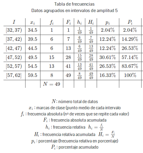 Construye una tabla estadística de frecuencias, agrupando los resultados en intervalos de amplitud 5.
