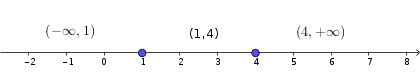 Observamos que los puntos 1 y 4 no pertenecen a la solución (no cumplen la inecuación) por lo que el intervalo solución lo hemos puesto abierto (sin incluir ni el 1 ni el 4)