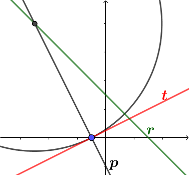 Para hallar la ecuación de la recta (p) tenemos un punto por donde pasa (T , el de tangencia) y como vector director, un vector perpendicular al vector director de t)
