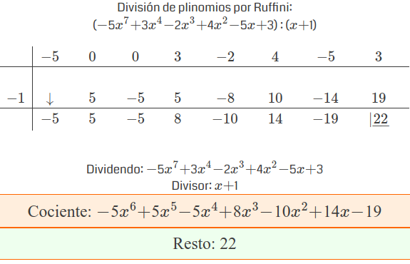Dividir polinomios usando Ruffini Ejercicios_Resueltosoperaciones_con_polinomiospolinomiosRuffini Usa la Regla de Ruffini para calcular el cociente y el resto de la siguiente división de polinomios: SOLUCIÓN Comentar el ejercicio