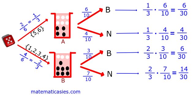 Lanzamos un dado, si sale 5 o 6 extraemos una bola de una urna A, que contiene 6 bolas