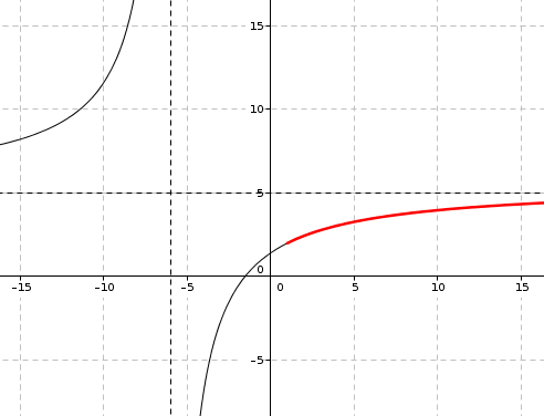 Otra manera de verlo: La gráfica de la función es una hipérbola (que son siempre crecientes o siempre decrecientes). Si vemos la gráfica (en el apartado siguiente) comprobamos que es creciente, por tanto el número de montajes irá aumentando, aunque sin llegar a rebasar los 5.5 (tiene una asíntota horizontal en