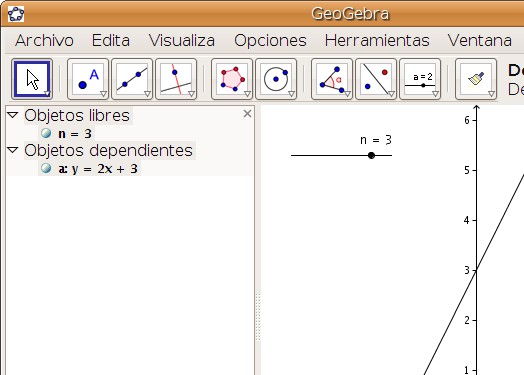 Para que nuestra variable pueda ser modificada dinámicamente debemos mostrarla en forma de deslizador. Para ello basta con hacer clic-derecho sobre n=3 (en la zona algebraica, objetos libres) y elegir "Expone Objeto"