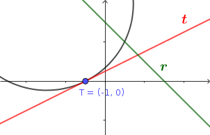 Para hallar la ecuación de la recta (p) tenemos un punto por donde pasa (T , el de tangencia) y como vector director, un vector perpendicular al vector director de t)