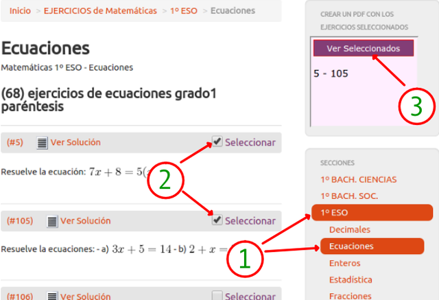 2) En el listado de ejercicios (del tema seleccionado), hacemos clic sobre los que queramos incluir en nuestra selección.