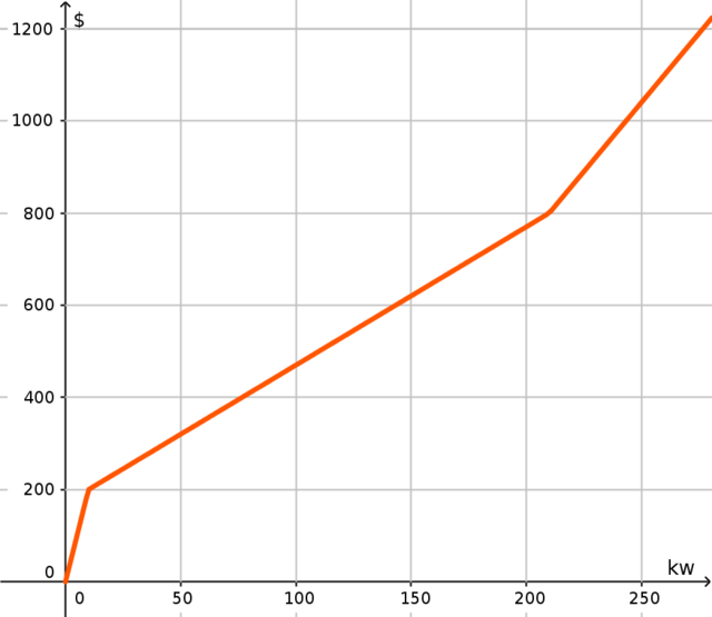 Creamos una función a trozos que nos calcule el precio de la factura según los kw/h consumidos.