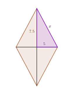 Dibujamos el rombo, le asignamos "x" al lado (desconocido) y nos fijamos en el triángulo rectángulo resaltado donde sus catetos serán la mitad de las diagonales.