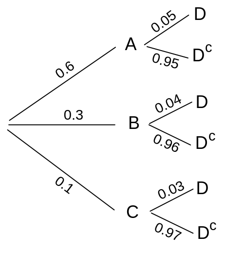 Una empresa dispone de tres máquinas A, B y C, que fabrican, respectivamente, el 60%, 30% y 10% de los artículos que comercializa. El 5% de los artículos que fabrica A, el 4% de los de B y el 3% de los de C son defectuosos. Elegido, al azar, un artículo de los que se fabrican en la empresa: