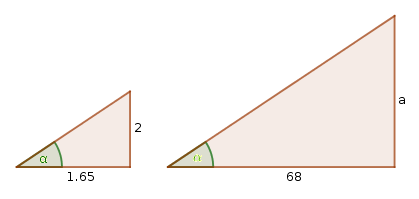Averigua la altura de una casa que proyecta una sombra de 68 m. sabiendo que en el mismo instante, una persona de 2 m. de alta, proyecta una sombre de 165 cm.