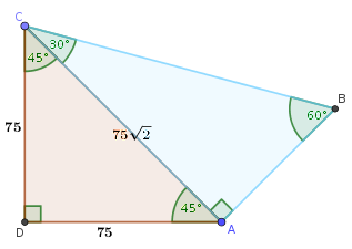 El triángulo rojo DAC es isósceles, con dos ángulos iguales de 45º y por tanto sus dos catetos también son iguales, con lo que el lado DC mide 75 m igual que el otro cateto.