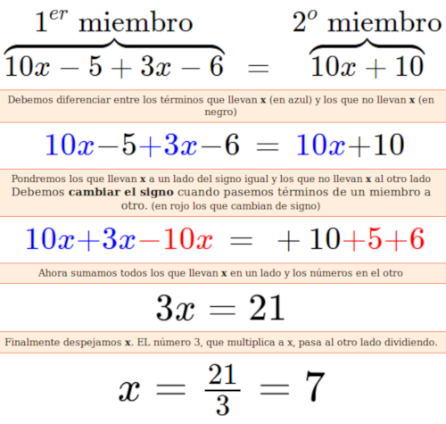ecuaciones grado1 paréntesis 💬 3 ecuacionesecuaciones de primer gradoecuaciones_con_paréntesisEjercicios_Resueltos Resuelve la ecuación: SOLUCIÓN Quitamos paréntesis Comentar el ejercicio Mensajes 18 de diciembre de 2006, 11:19, por dani 12 de octubre de 2011, 03:13 €€€€€€ Tienen que explicarlos! ;) 21 de marzo de 2014, 19:54, por micaela +10x-5+3x-6=+10x+1 +10x+3x-10x=+1+6+5 +13x=+12 x=+12:+13 x=+1